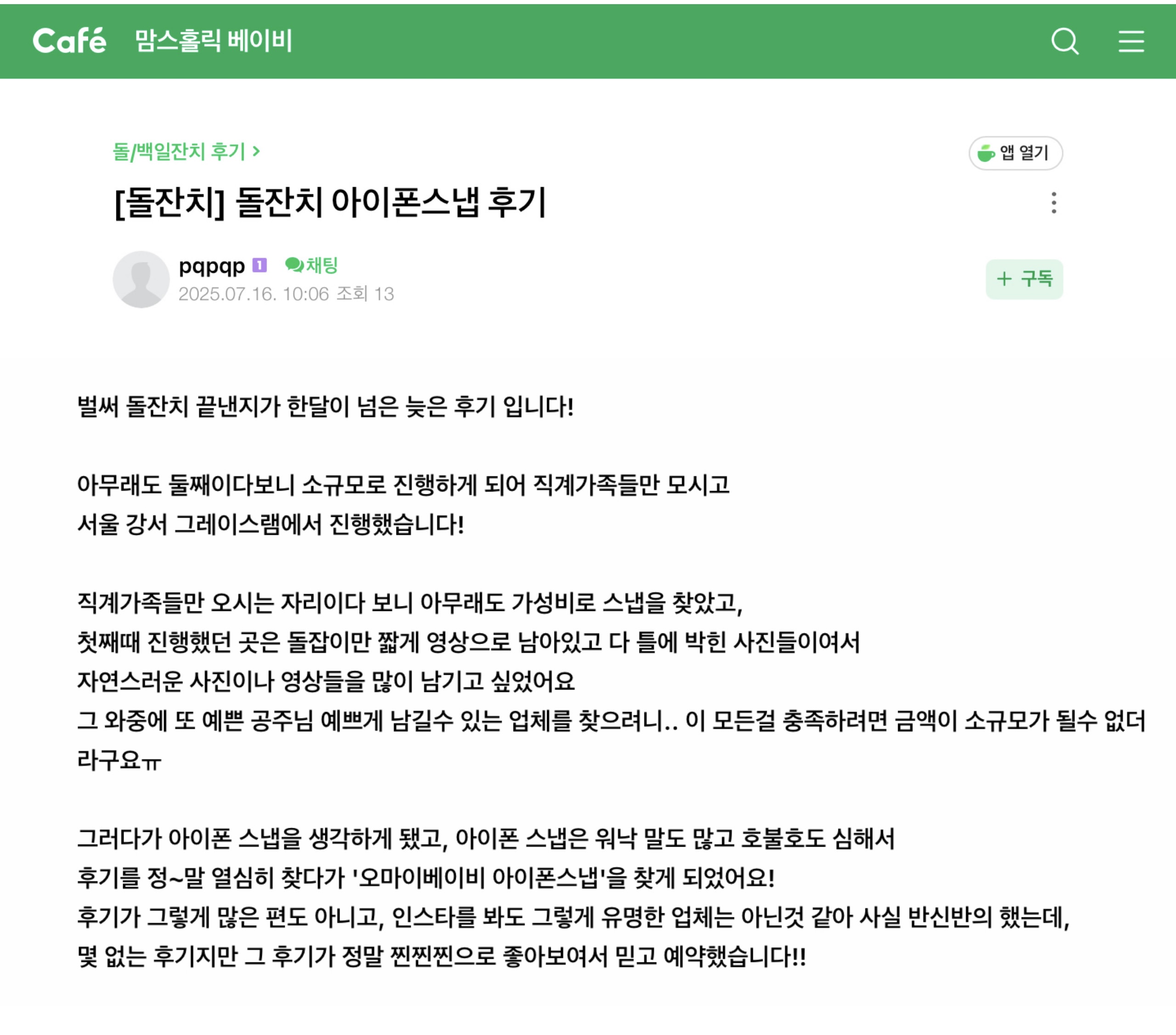 | [돌스냅 후기] 디앤소 스튜디오 2호점 돌잔치 (2) | 2025.08.14 |