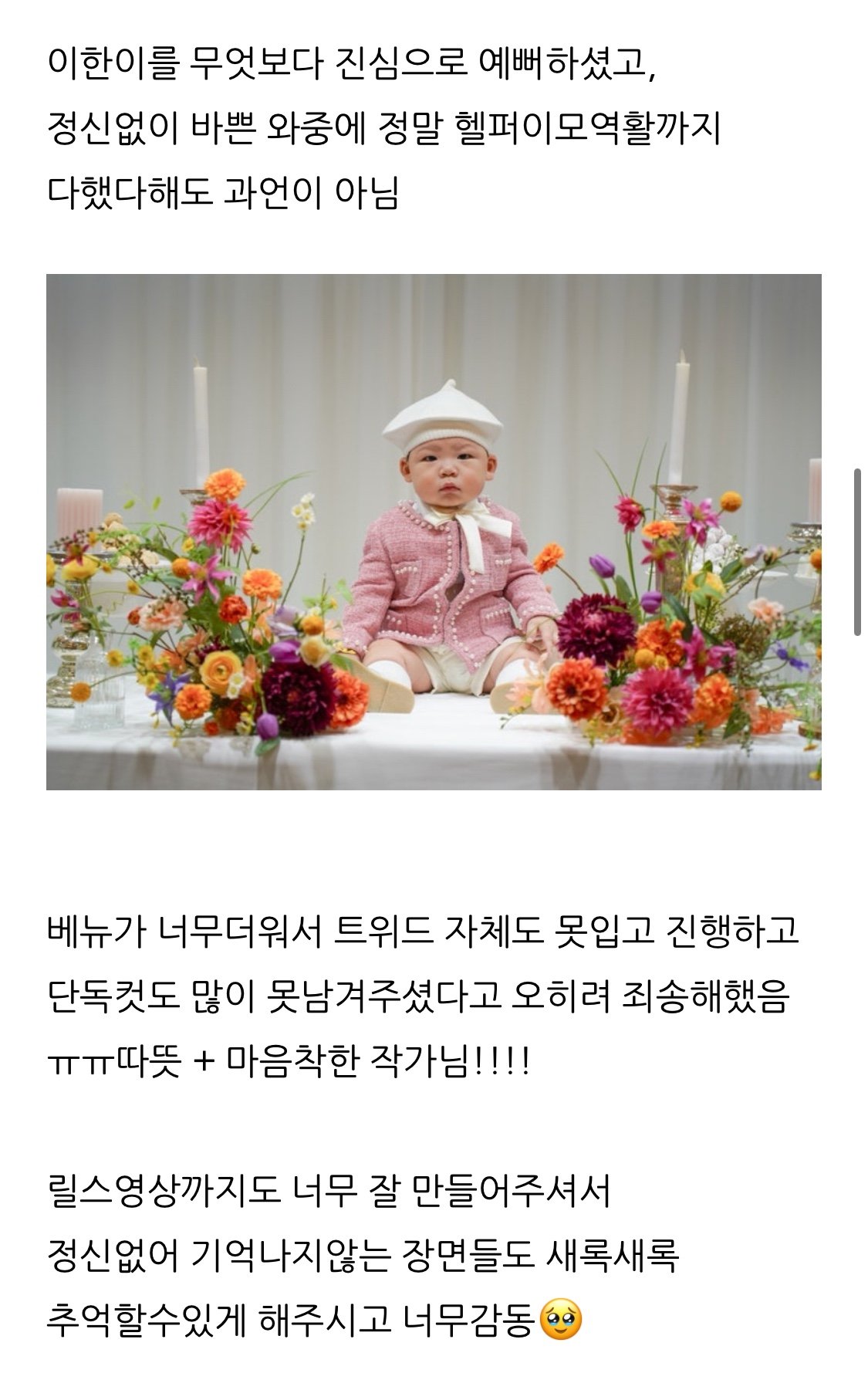 촬영 당시 컨디션이 엄청 좋았는데, 오히려 룸이 너무 더워 아기가 많이 울었던 기억이 있습니다.